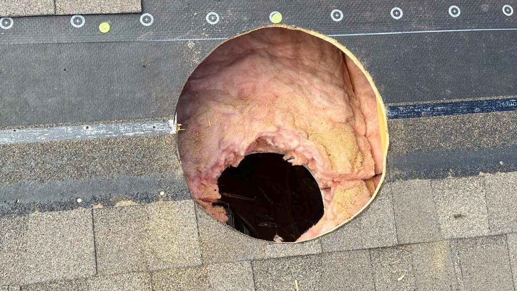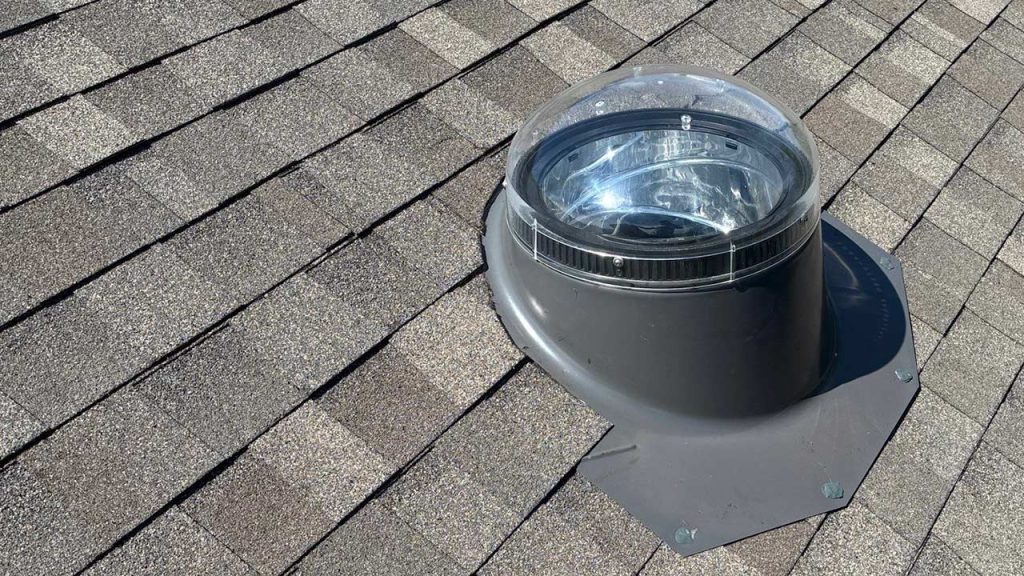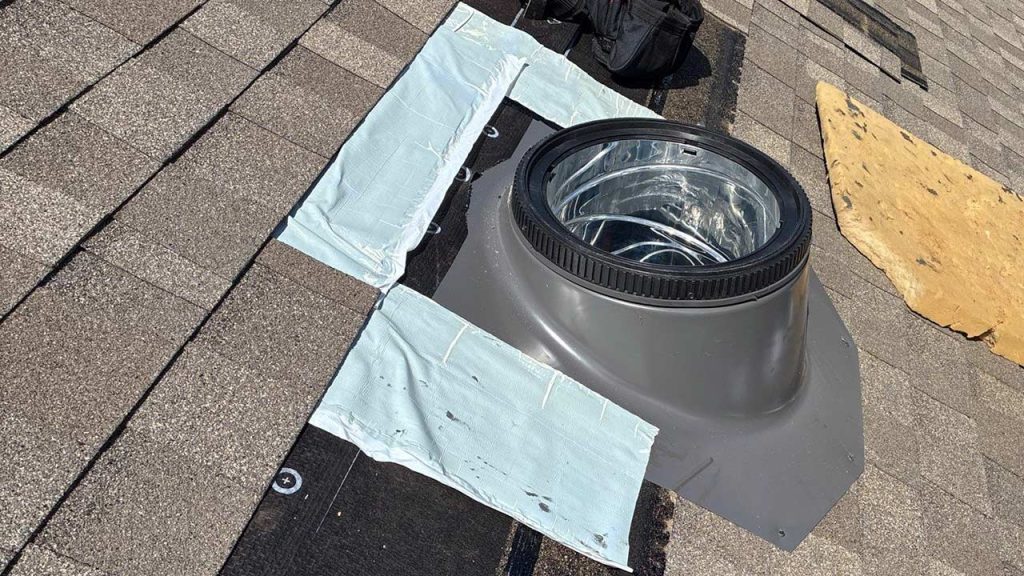 Up on the roof, shingles are removed in the area around the nail. The opening is cut, the flashing is attached to the roof and the shingles replaced.. The tubing is inserted and the dome is installed. All that remains is connecting the tubing to the ceiling diffuser and clean up.