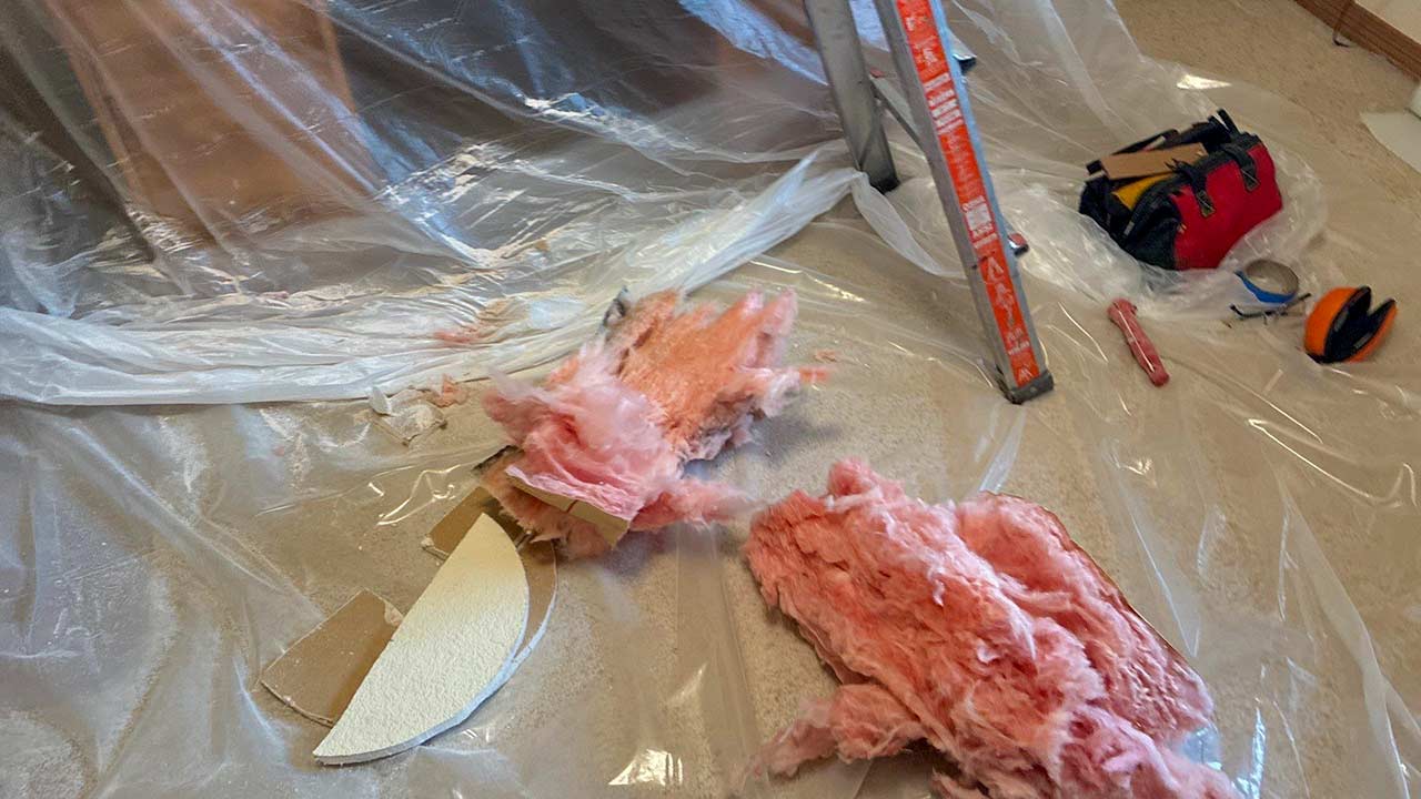 Installation begins with customer and installer determining the exact location for the new Sun Tunnel. Debris protection is setup and the opening is cut in the ceiling. Then, up in the attic, the location for the roof opening is marked with a nail.